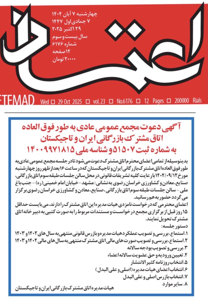 آگهی فراخوان برگزاری مجمع عمومی عادی به طور فوق العاده و انتخابات هیات مدیره و بازرس اتاق مشترک بازرگانی ایران و تاجیکستان