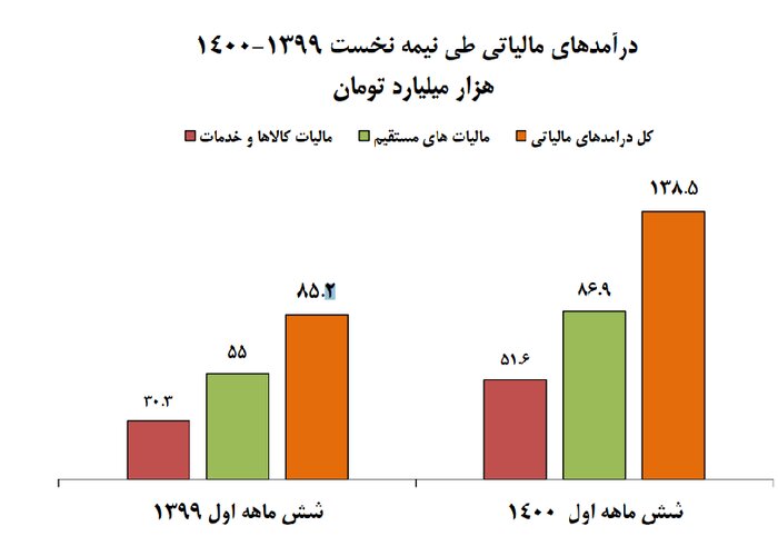 طبق گزارش منتشر شده دو بخش مهم درآمدهای مالیاتی؛ مالیات‌های مستقیم و مالیات کالاها و خدمات است که این دو جزء هم در نیمه نخست ۱۴۰۰ در مقایسه با مدت مشابه در سال قبل به ترتیب با افزایش ۵۸ و ۷۰ درصدی همراه بوده اند.