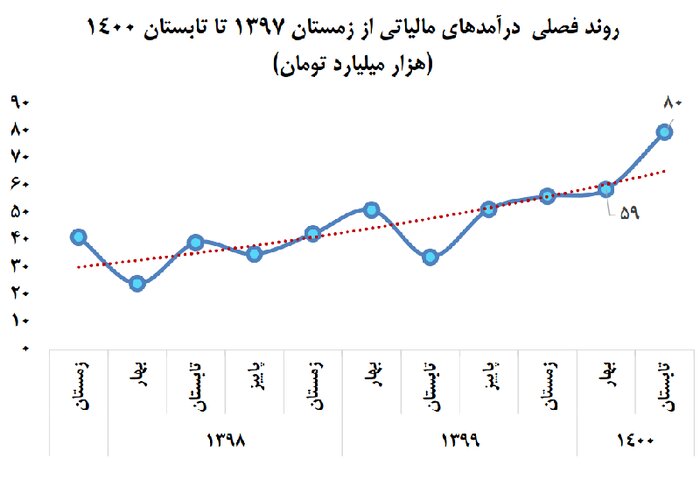 همچنین، طی بازه زمانی مورد بررسی یعنی از فصل چهارم ۱۳۹۷ الی فصل دوم ۱۴۰۰، روند عمومی فصلی درآمدهای مالیاتی افزایشی است. باستثنای تابستان سال ۱۳۹۹ که به دلیل رکود فعالیت‌های اقتصادی ناشی از همه‌گیری کرونا، افت فصلی درآمدهای مالیاتی اتفاق افتاد، در تابستان ۱۴۰۰ برای دومین فصل پیاپی درآمدهای مالیاتی افزایش یافت و به ۸۰ هزار میلیارد تومان رسید که این رقم نسبت به فصل قبل با افزایش حدود ۳۶ درصدی و نسبت به فصل مشابه سال قبل بیش از دو برابر شده است.