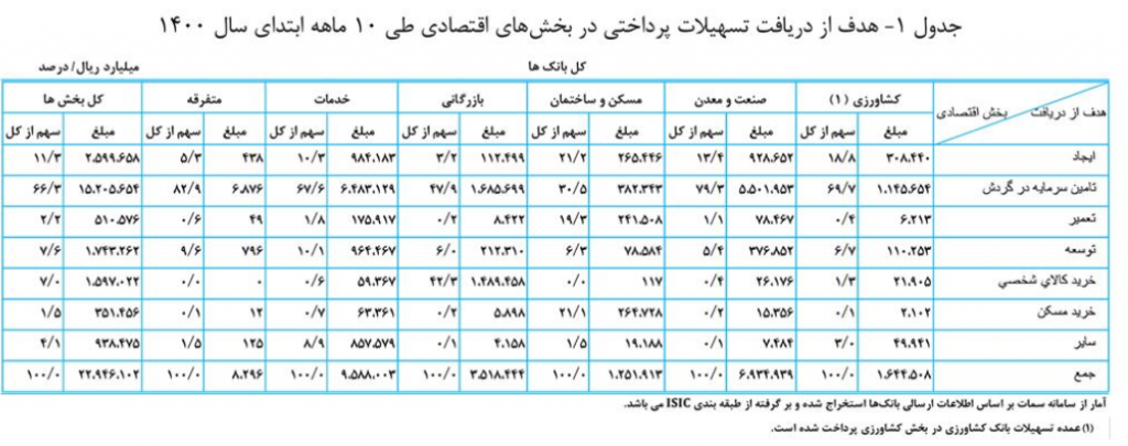 تسهیلات پرداختی بانک‌ها در ۱۰ ماهه سال ۱۴۰۰ به بخش‌های اقتصادی ۲۲ هزار و ۹۶۴ هزار میلیارد ریال است که در مقایسه با دوره مشابه سال قبل هشت‌هزار و ۵۵۲ هزار میلیارد ریال، معادل ۵۹.۴ درصد افزایش نشان می‌دهد.