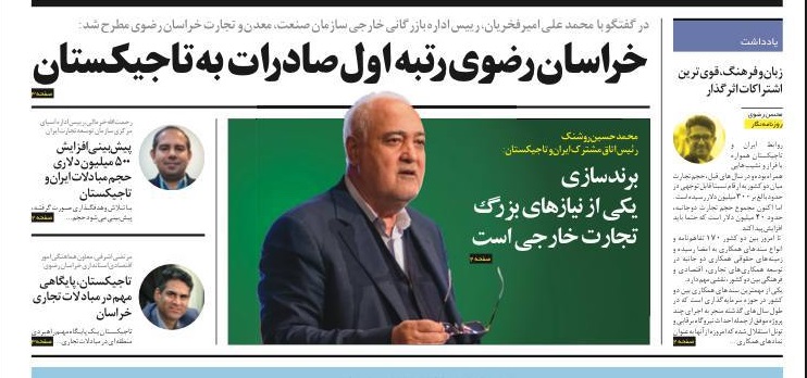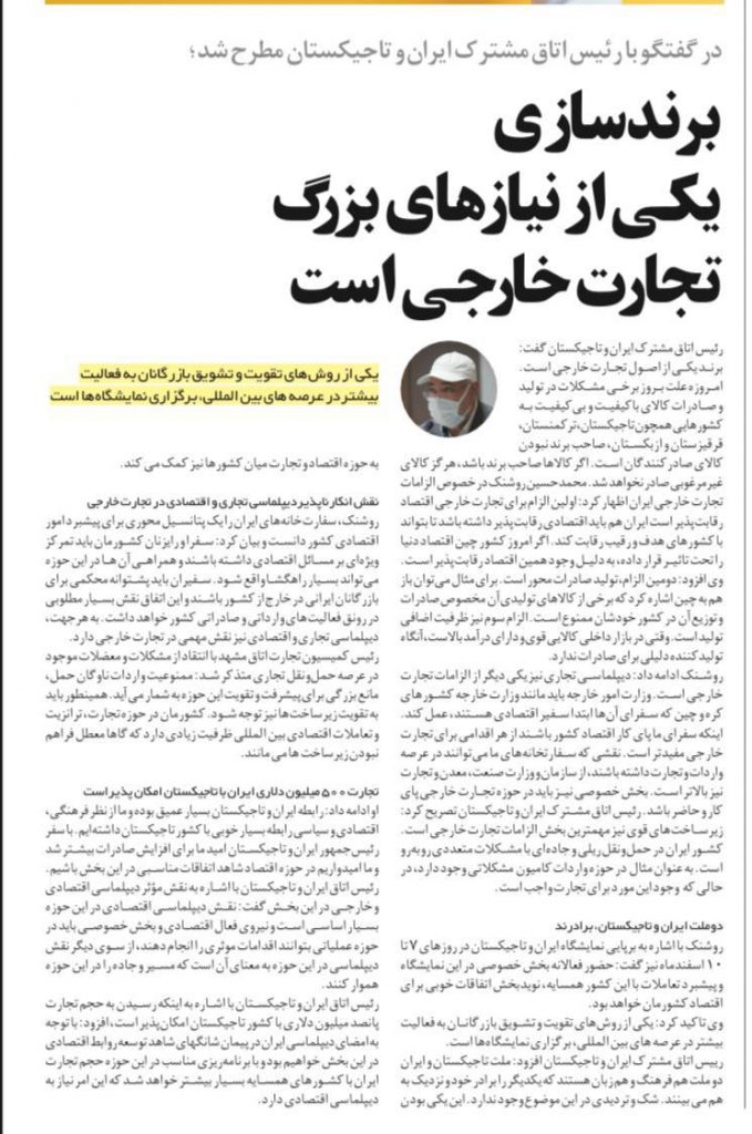 محمد حسين روشنك، رئيس اتاق مشترک ایران و تاجیکستان  برند سازي يكي از نيازهاي بزرگ تجارت خارجي است يكي از روشهاي تقويت و تشويق بازرگانان به فعاليت بيشتر در عرصه هاي بين المللي، برگزاري نمايشگاه ها است  تجارت ٥٠٠ ميليون دلاري ايران با تاجيكستان امكان پذير است روزنامه اقتصادي آسيابهمن ماه ١٤٠٠