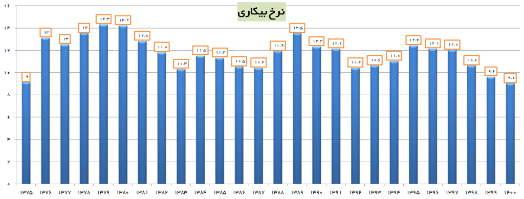 بر اساس گزارش مرکز آمار، در سال ۱۴۰۰ نرخ بیکاری به ۹ درصد رسید که پایینترین رقم آن در دهههای اخیر محسوب میشود.