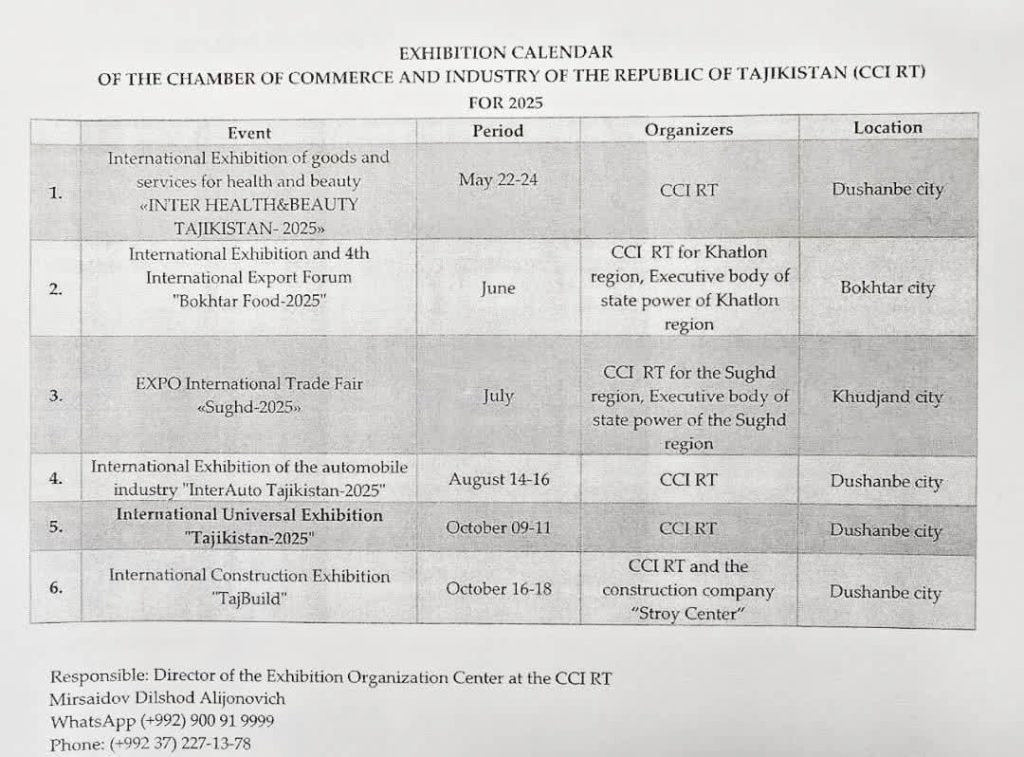 اتاق بازرگانی و صنعت جمهوری تاجیکستان در سال 2025 میزبان 6 نمایشگاه بین‌المللی است که فهرست این نمایشگاه‌ها منتشر شده است. علاقه‌مندان جهت کسب اطلاعات بیشتر می‌توانند از طریق شماره واتساپ +992900919999، شماره تلفن +992372271378 و یا نشانی پست الکترونیکی mirsaidov.d@inbox.ru با دلشاد میرسعیداف، مسئول هماهنگی این نمایشگاه‌ها تماس بگیرند.