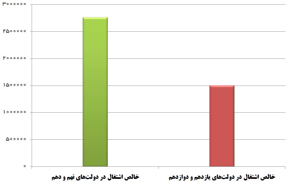 بدین ترتیب میزان رشد اشتغال خالص در دولتهای یازدهم و دوازدهم نسبت به دولتهای نهم و دهم، ۴۶ درصد کاهش یافت و از ۲٬۷۶۷٬۱۴۵ نفر به ۱٬۵۰۴٬۱۷۰ رسید که به عبارتی میتوان گفت دولت روحانی نسبت به دولت احمدینژاد ۱٬۲۶۲٬۹۷۵ خالص شغل کمتری ایجاد کرد.