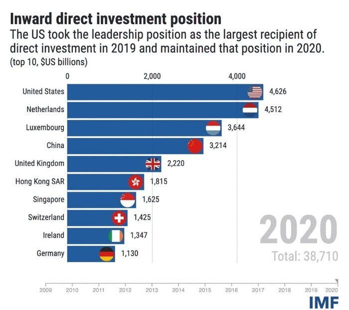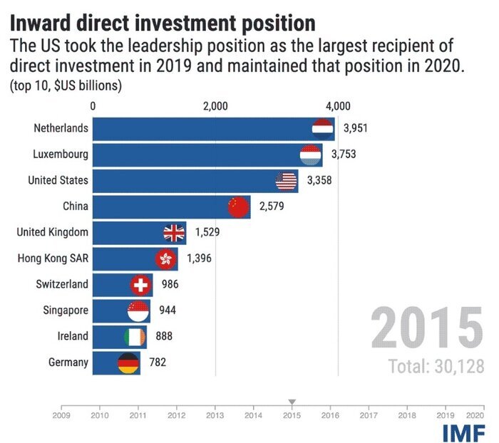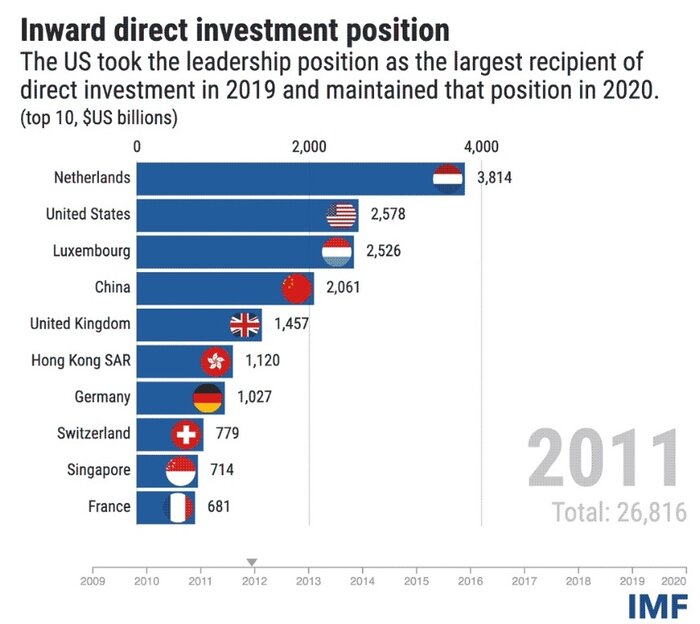 بررسی موسسه Coordinated Direct Investment Survey نشان میدهد که ۱۰ دریافتکننده برتر سرمایهگذاری مستقیم خارجی در جهان در طول سالیان اخیر تا پایان سال ۲۰۲۰، هلند،ایالات متحده، لوکزامبورگ، چین و بریتانیا، هنگکنگ، سنگاپور، سوئیس، ایرلند و آلمان بودند.