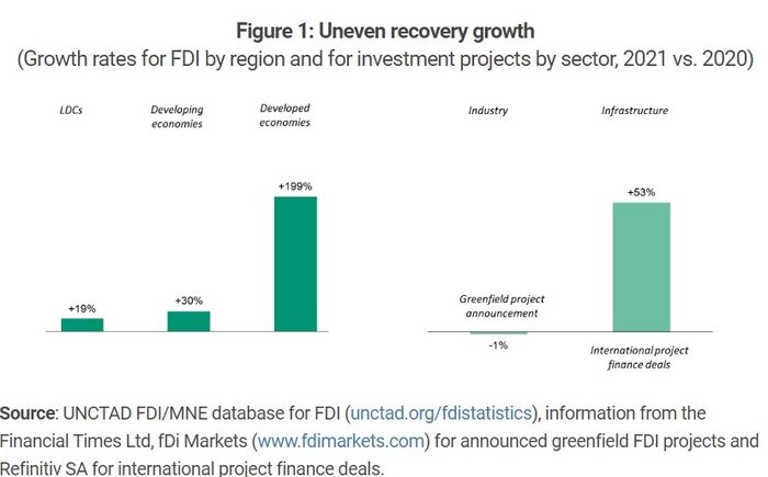 گزارش این نهاد سازمان ملل نشان میدهد که اقتصادهای توسعهیافته بیشترین رشد سرمایهگذاری را داشتهاند، به طوری که سرمایهگذاری مستقیم خارجی آنها در سال ۲۰۲۱ به ۷۷۷ میلیارد دلار رسید که سه برابر سطح بسیار پایین در سال ۲۰۲۰ بوده است.