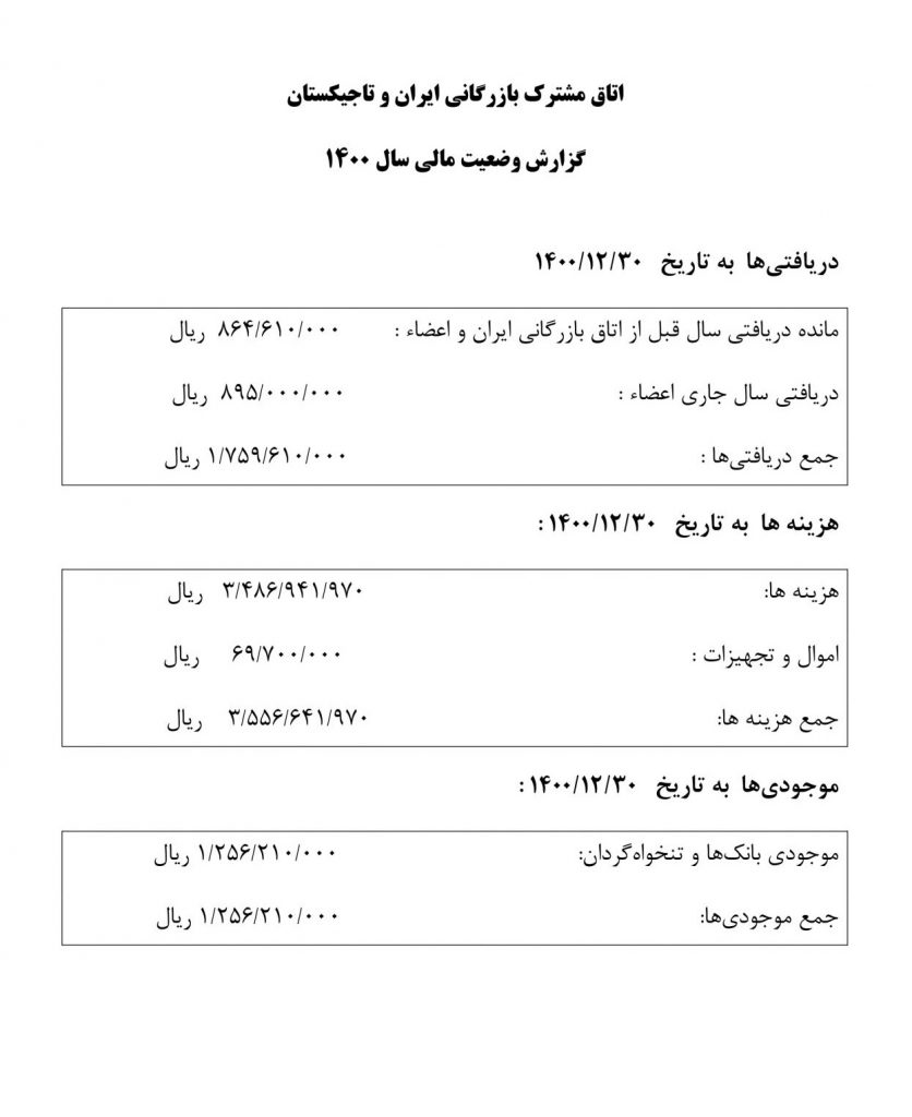 گزارش وضعیت مالی دریافتی و گزارش وضعیت هزینه 1400 اتاق مشترک ایران و تاجیکستان
