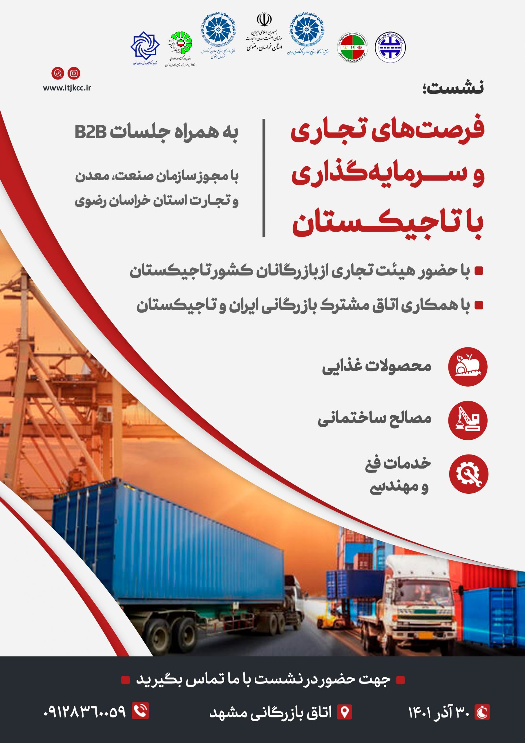 اطلاعيه 📣 برگزاري نشست فرصتهاي تجاري و سرمايهگذاري با تاجيكستان ⏱ زمان برگزاري : روز چهارشنبه مورخ ١٤٠١/٠٩/٣٠ 🏢 مكان برگزاري: اتاق بازرگاني،صنايع، معادن و كشاورزي خراسان رضوي 👈👈 علاقمندان جهت كسب اطلاعات بيشتر و ثبت نام در جلسات B2B با شماره تلفن ٠٩١٢٨٣٦٠٠٥٩ تماس حاصل نمايند